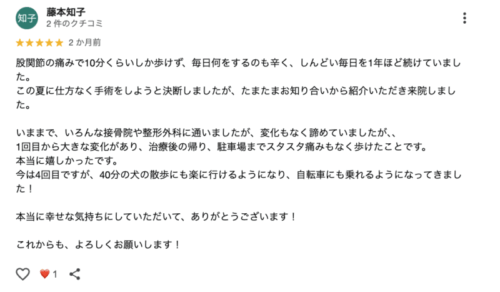 この夏に手術を決断していましたが…たった数回の施術で、痛みなく歩けるようになりました!