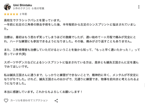 立っているだけで痛かったシンスプリントが2.3回の施術でほぼ痛み0に!