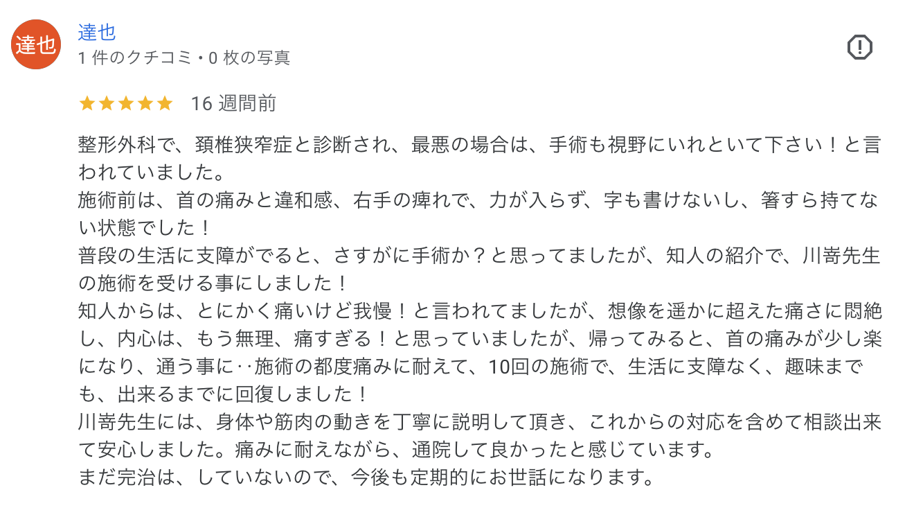 川嵜先生には、身体の仕組みや痛みの原因、川嵜先生の施術の意味をわかりやすく説明していただき、痛い施術も意味がある理解し、我慢できました。