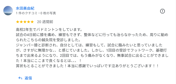 試合の4日前に膝を痛め、練習もできず、整体などに行っても治らなかったため、周りに勧められたこちらの鍼灸院を受診しました。