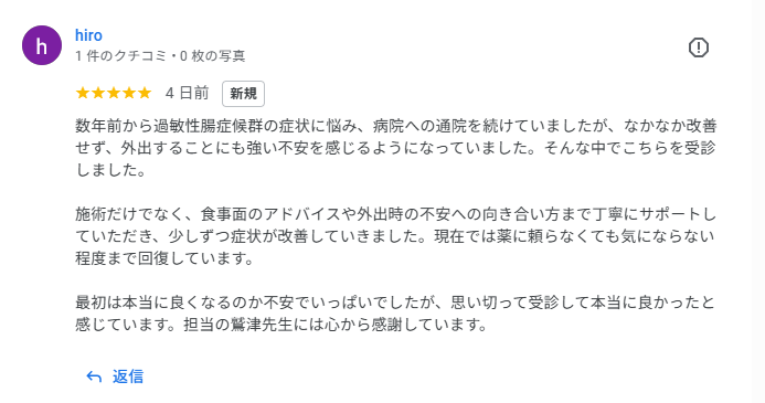施術だけでなく、食事面のアドバイスや外出時の不安への向き合い方まで丁寧にサポートしていただき、少しずつ症状が改善していきました。現在では薬に頼らなくても気にならない程度まで回復しています。
